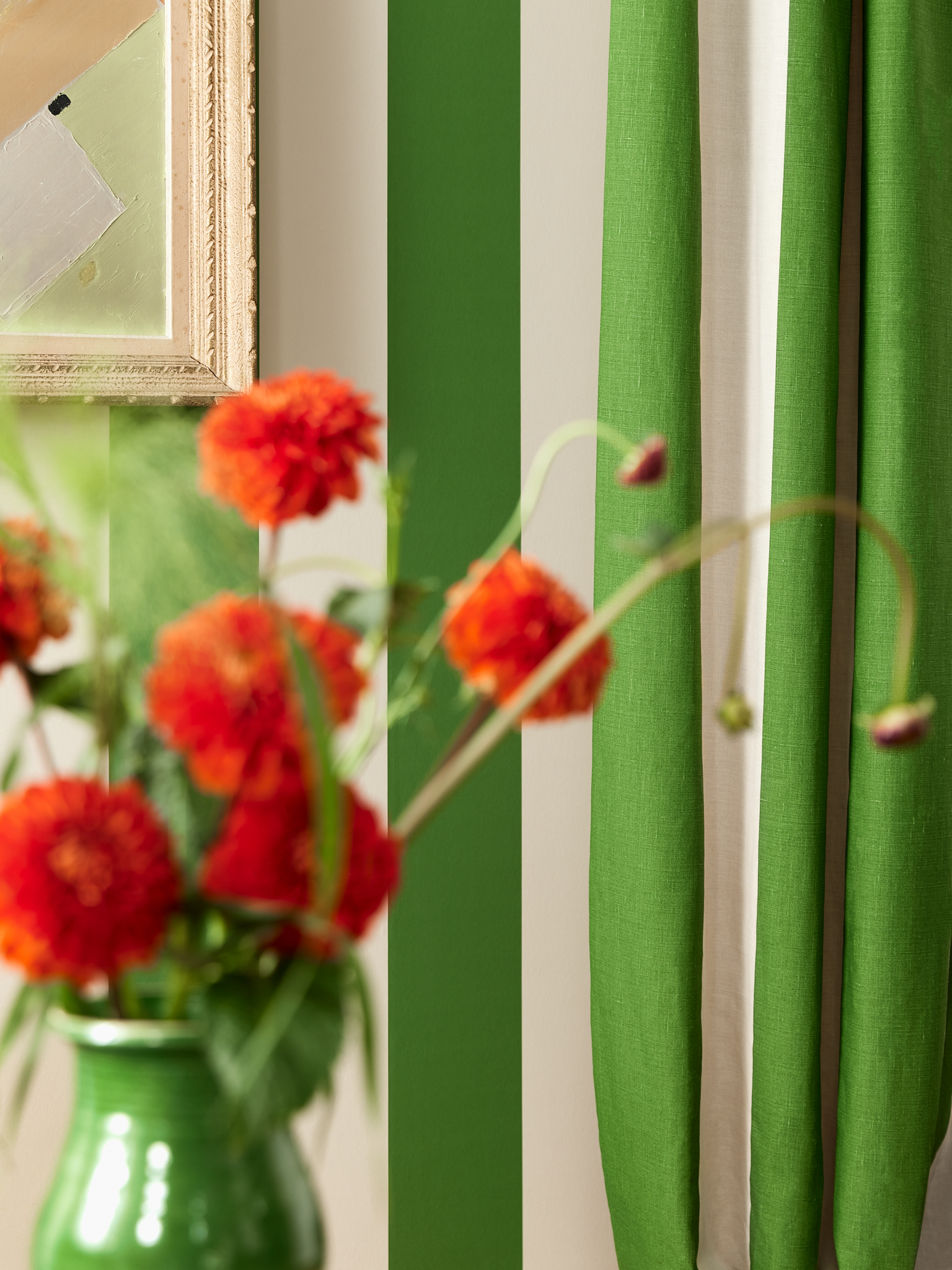 As an eternal stripe lover; my collection would be incomplete without one, introducing the Arthur Stripe wallpaper. This bold, wide-scale vertical striped wallpaper is here to satisfy your passion for stripes and transform any space with its timeless charm and versatile appeal. Meticulously crafted on linen with a contemporary feel, Arthur is the perfect addition to any interior and will elevate the scheme of a room. For a complete and harmonious look, Arthur Stripe wallpaper looks wonderful paired with the matching stripe linen. For the perfect pairing offset with either of my stylised florals; Raine linen or James wallpaper. Arthur is named after my cool, sporty, and courageous godson. The design and colourways represent his spirit and charisma, bringing a sense of adventure to any room. Currently available in 8 colourways - Castle Wall, Baked Apple, Rose Dust, Elephants Blue, Pickled Green, Stoney Blue, Rose Tan and Plaster Pink. All colourways are also available on matching wallpaper. For information on complimentary paint colours, please contact us.