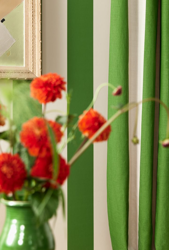 As an eternal stripe lover; my collection would be incomplete without one, introducing the Arthur Stripe wallpaper. This bold, wide-scale vertical striped wallpaper is here to satisfy your passion for stripes and transform any space with its timeless charm and versatile appeal. Meticulously crafted on linen with a contemporary feel, Arthur is the perfect addition to any interior and will elevate the scheme of a room. For a complete and harmonious look, Arthur Stripe wallpaper looks wonderful paired with the matching stripe linen. For the perfect pairing offset with either of my stylised florals; Raine linen or James wallpaper. Arthur is named after my cool, sporty, and courageous godson. The design and colourways represent his spirit and charisma, bringing a sense of adventure to any room. Currently available in 8 colourways - Castle Wall, Baked Apple, Rose Dust, Elephants Blue, Pickled Green, Stoney Blue, Rose Tan and Plaster Pink. All colourways are also available on matching wallpaper. For information on complimentary paint colours, please contact us.