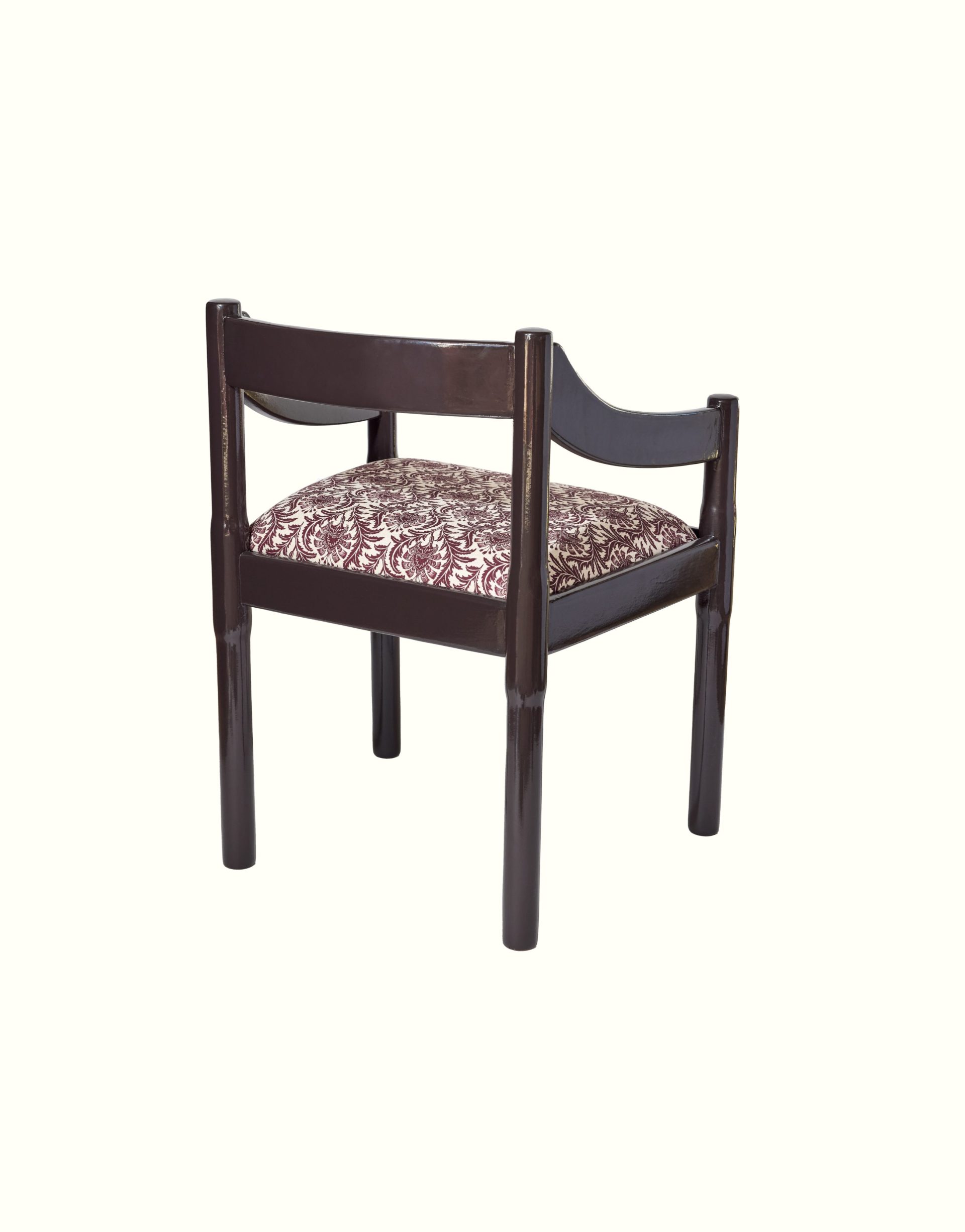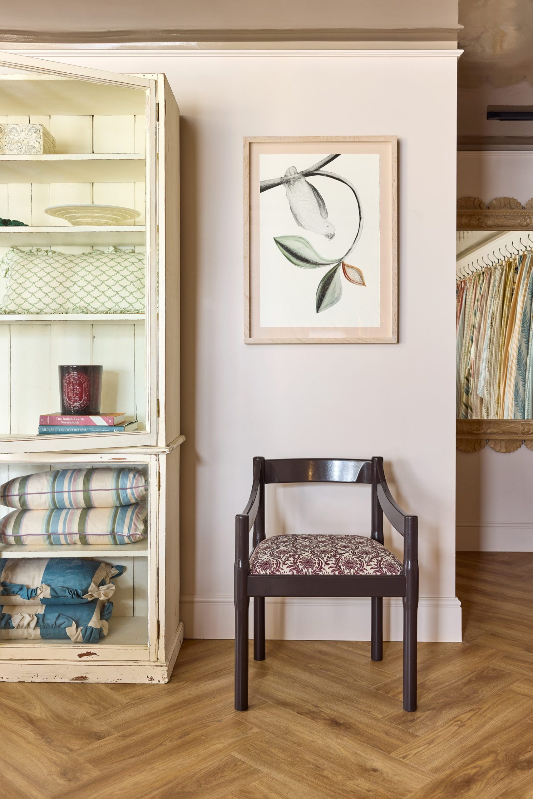 The chair is made in solid wood in a Farrow & Ball Full gloss finish in Tanners Brown No. 255. The seat pad is foam-filled and covered in one of our CINNY fabrics suitable for upholstery.