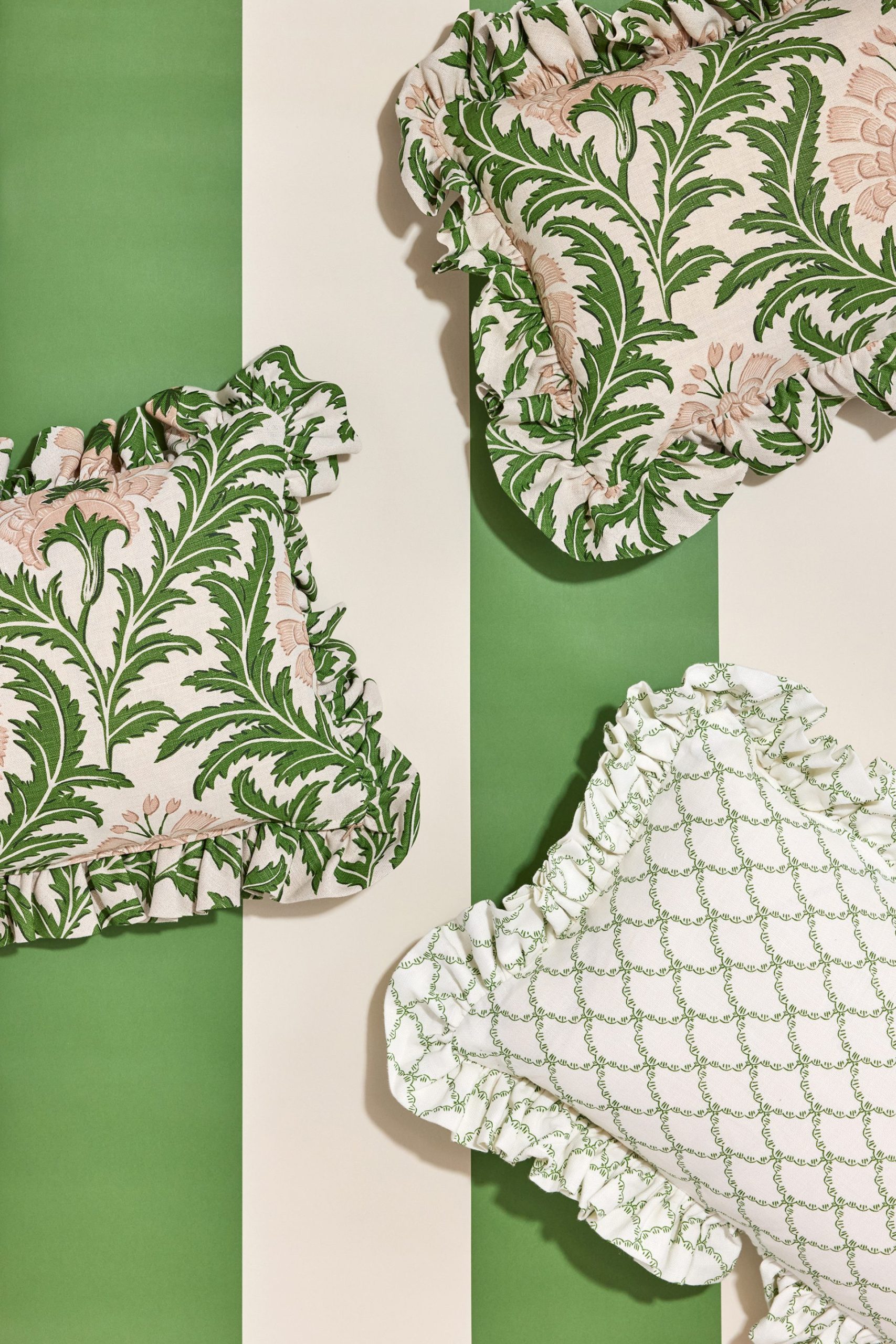 Our Betsy Frilly cushion is a fresh take on a timeless classic. Featuring a white and green scallop print fabric, this frilly pillow adds a charming look to any room. Finished with a ruffled edge, it blends charm and style — making it a most loved frilly cushion.